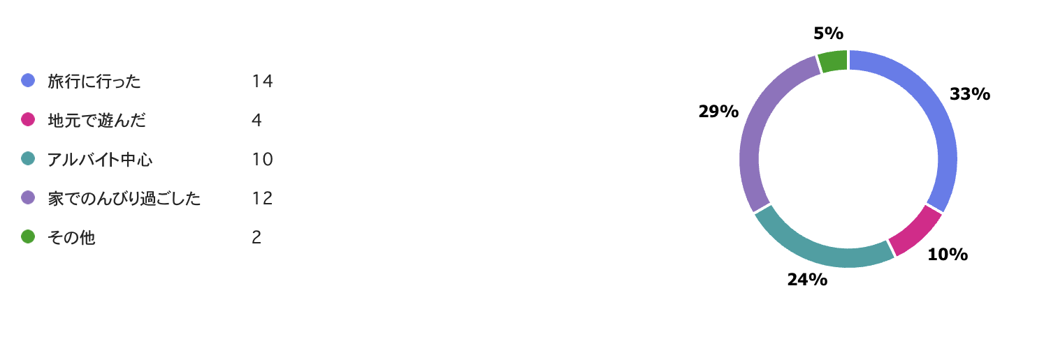 アンケートの結果、旅行に行った人、アルバイト中心の人、家でのんびり過ごした人が同じくらいに分かれる結果となりました!長期休みは旅行に行きやすくてとても嬉しいですよね✈️