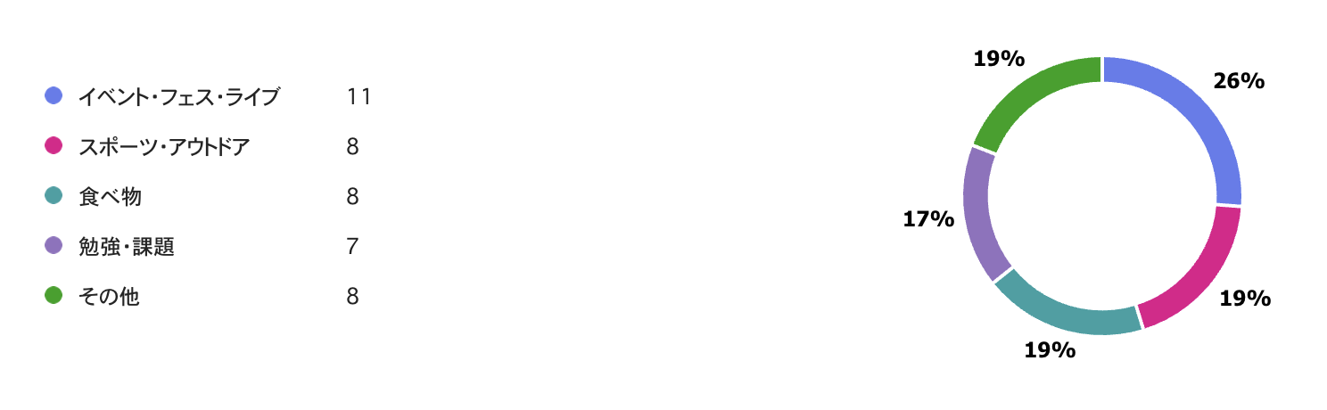 他にもスポーツ、アウトドア、食べ物を楽しんだり、課題に勤しんだ人もたくさんいたようです🏕️🍧📖