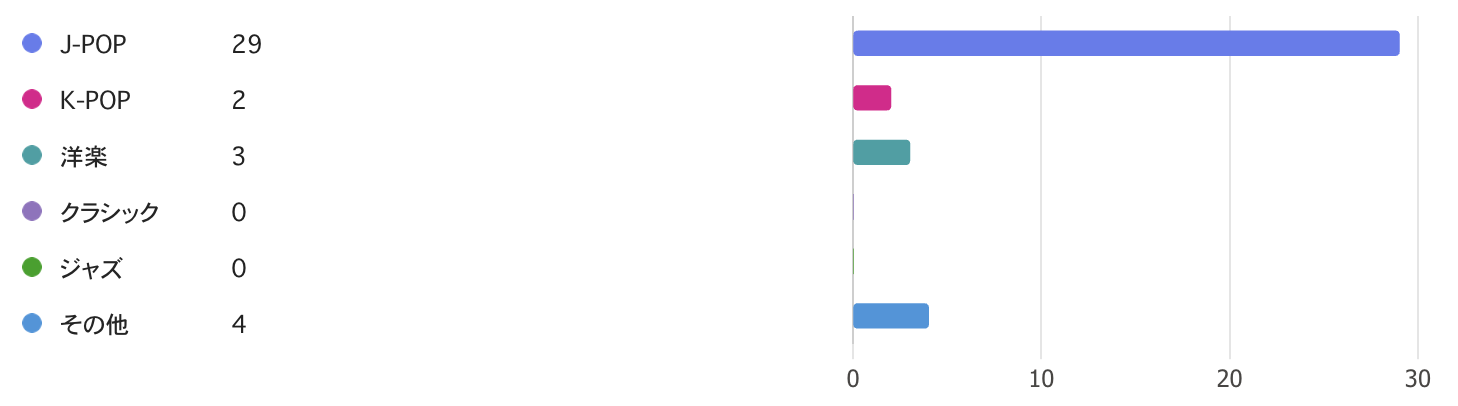 アンケートの結果、圧倒的J-POPが一番人気でした!!最近はK-POPの人気が高いと思っていたので少し意外な結果でした😯