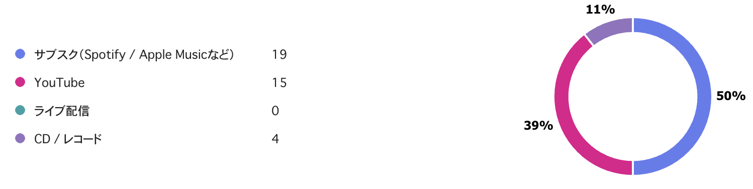 サブスクが一位!その次にYouTubeが多い結果となりました。少数ですがCDやレコードで聴くひともいました!渋くてかっこいいですね!!